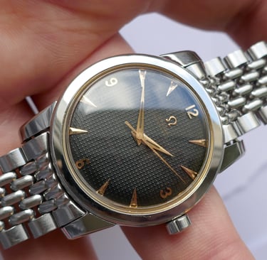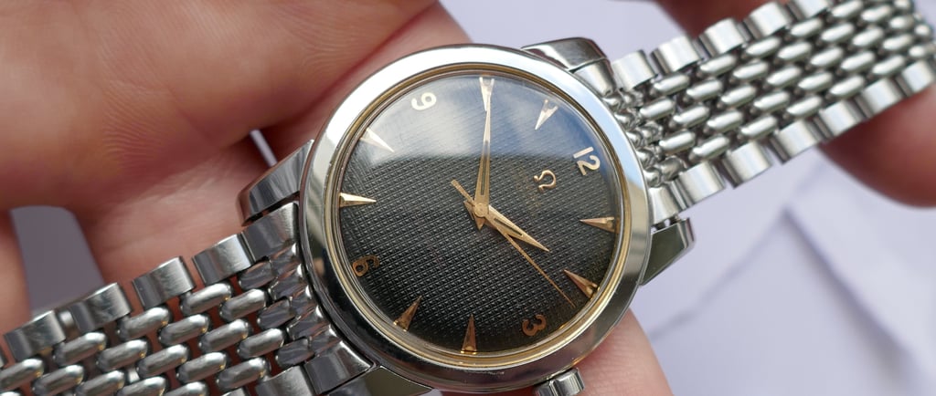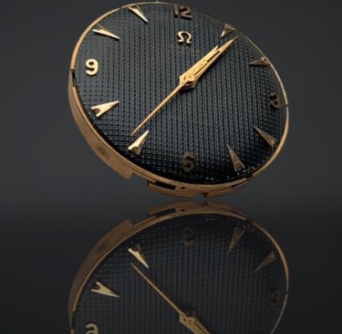 Exemple : Une Omega Seamaster de 1952 avec ses index "chevrons" et son cadran blanc immaculé. C'est le sommet de l'artisanat de l'époque, où chaque composant semble avoir été sculpté pour célébrer la lumière et l'obscurité.